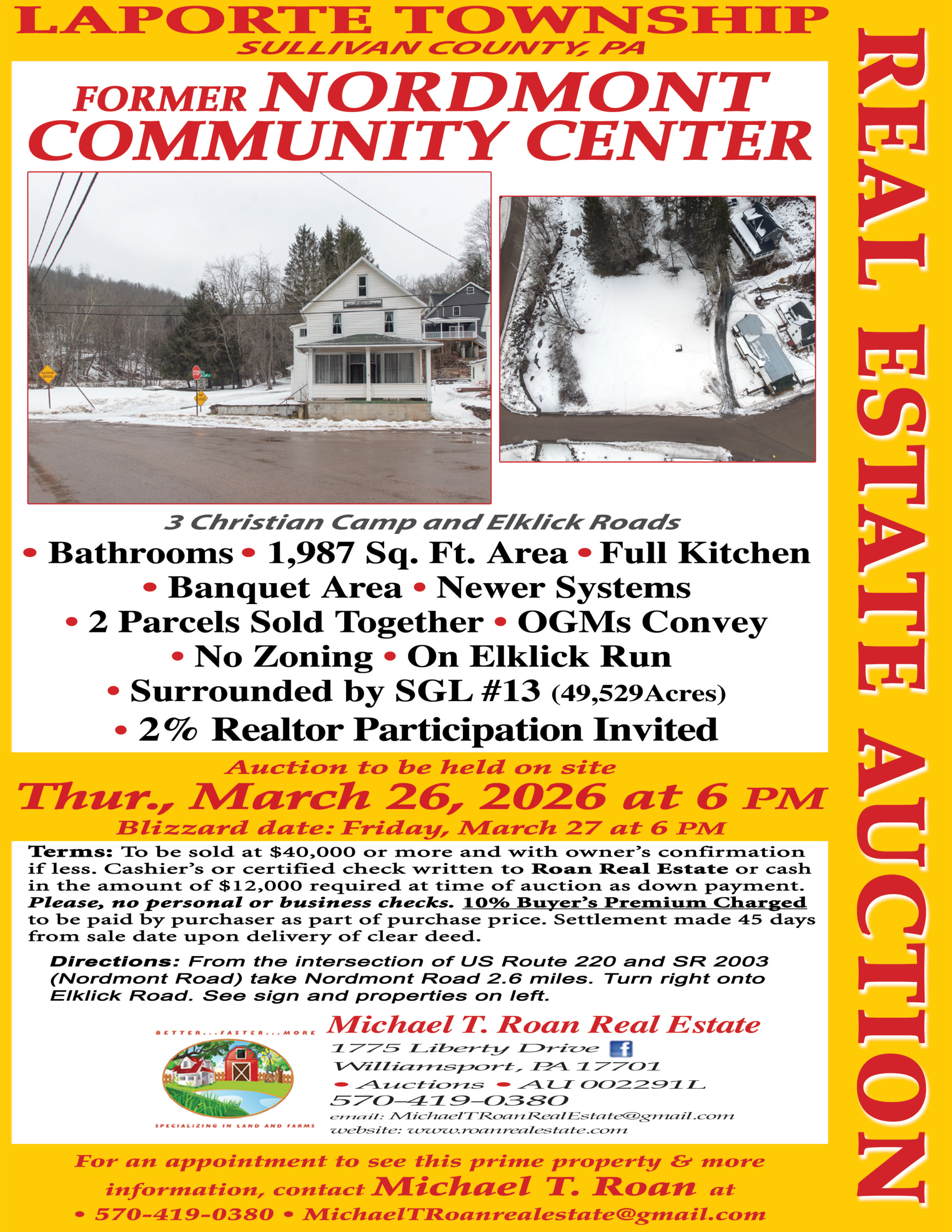 Terms: To be sold at $40,000 or more and with owner’s confirmation if less. Cashier’s or certified check written to Roan Real Estate or cash in the amount of $12,000 required at time of auction as down payment. Please, no personal or business checks. 10% Buyer’s Premium Charged to be paid by purchaser as part of purchase price. Settlement made 45 days from sale date upon delivery of clear deed.