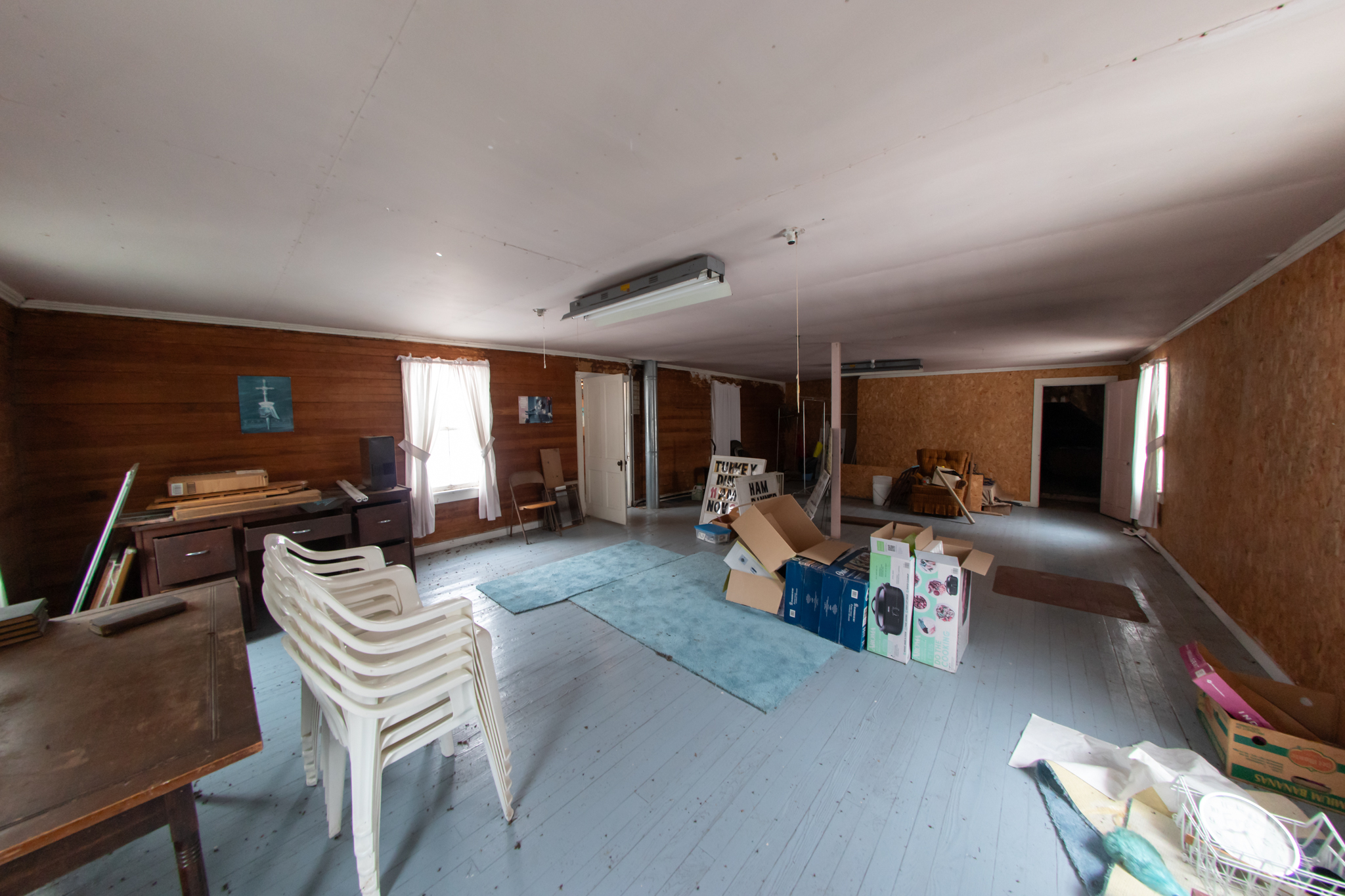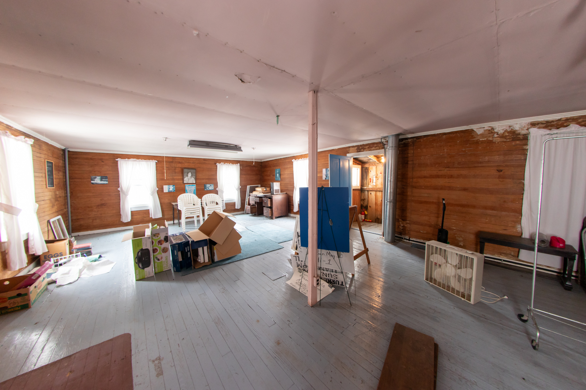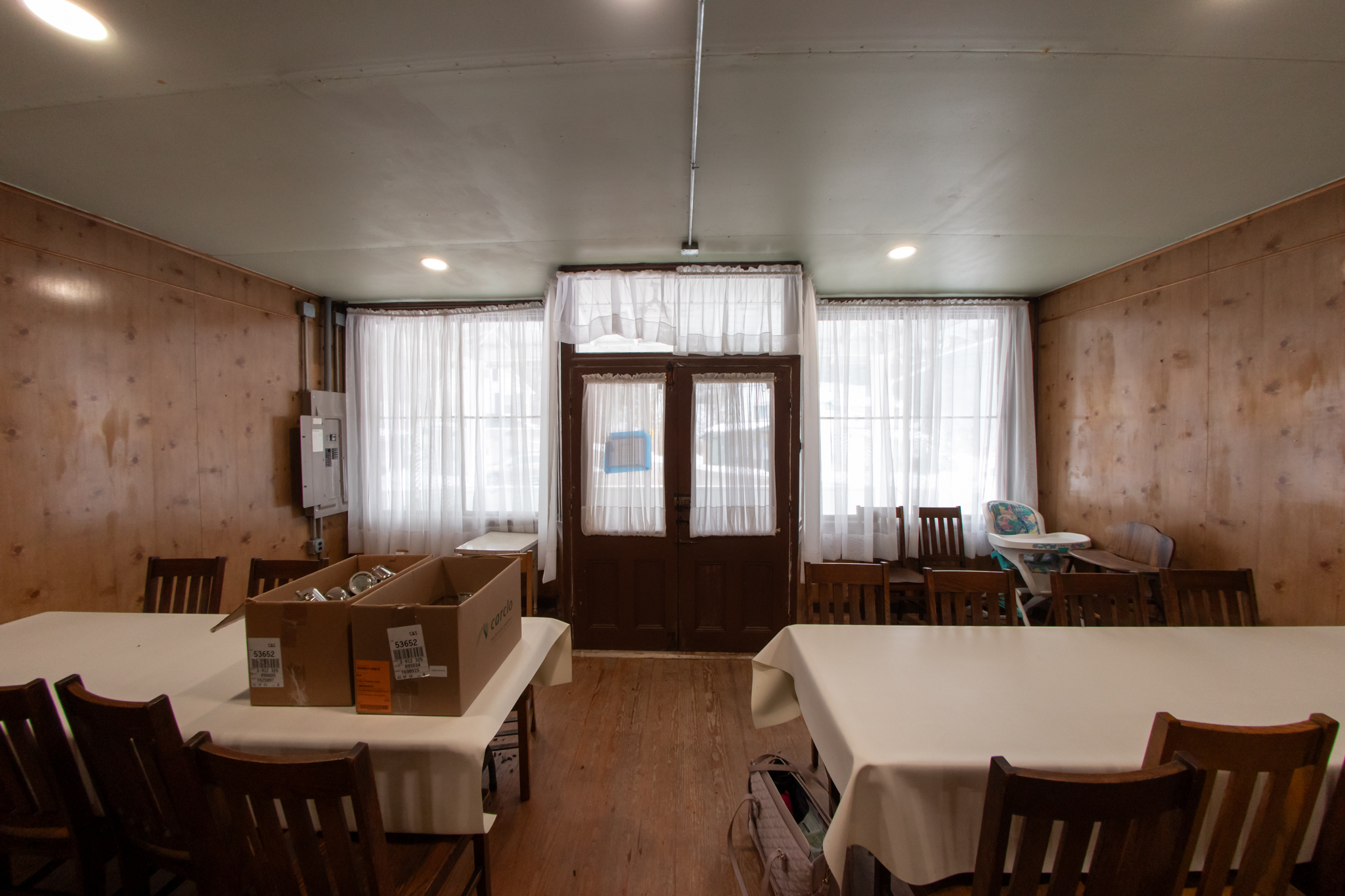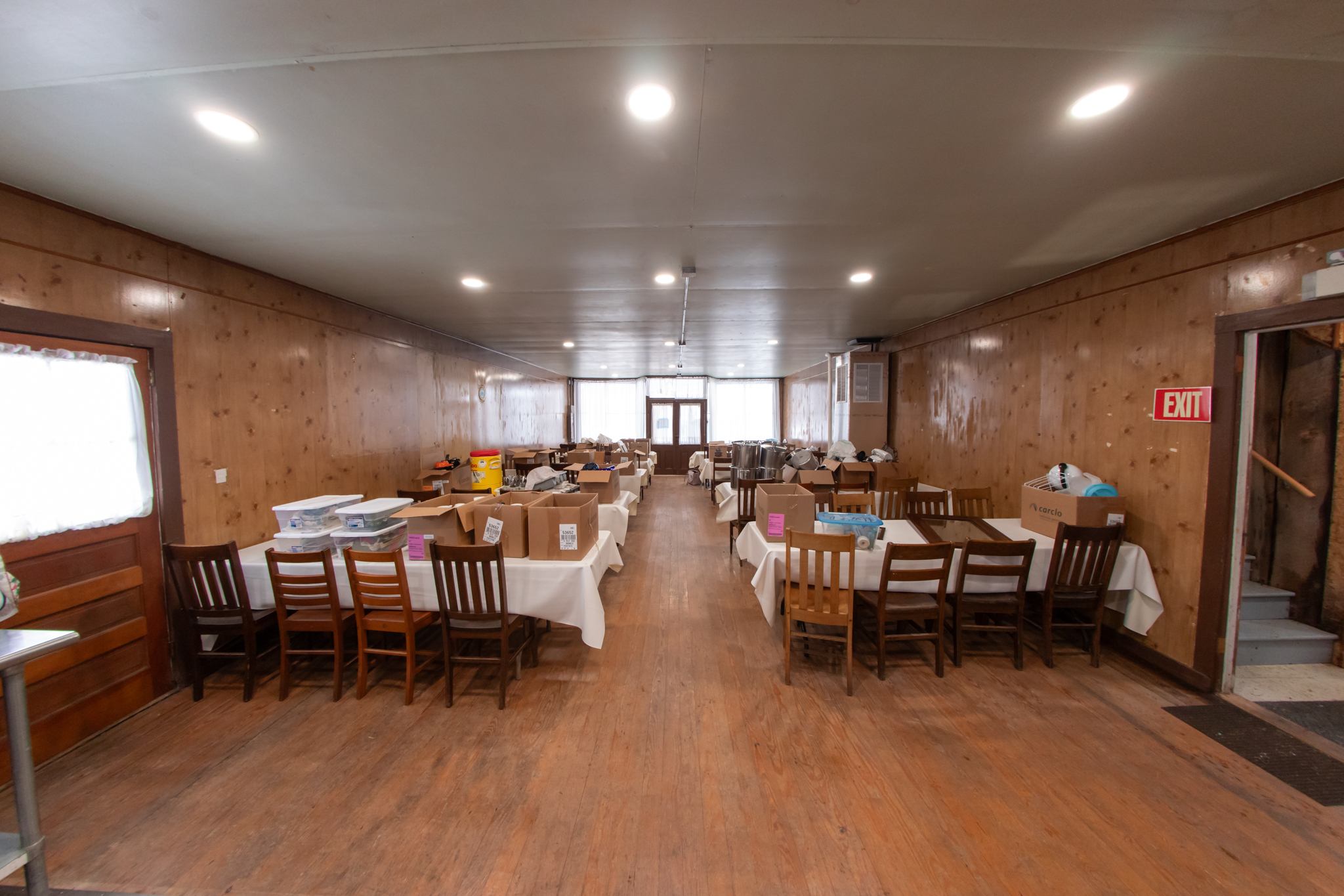 First Floor: Enter double front door of community hall to dining area with Yellow Pine floor, full front windows, 2 side and a rear exterior accesses, recessed lighting, fully furnished, large kitchen area has tile floors, wood cupboards and cabinets, sinks, fully furnished and has 2 bathrooms.