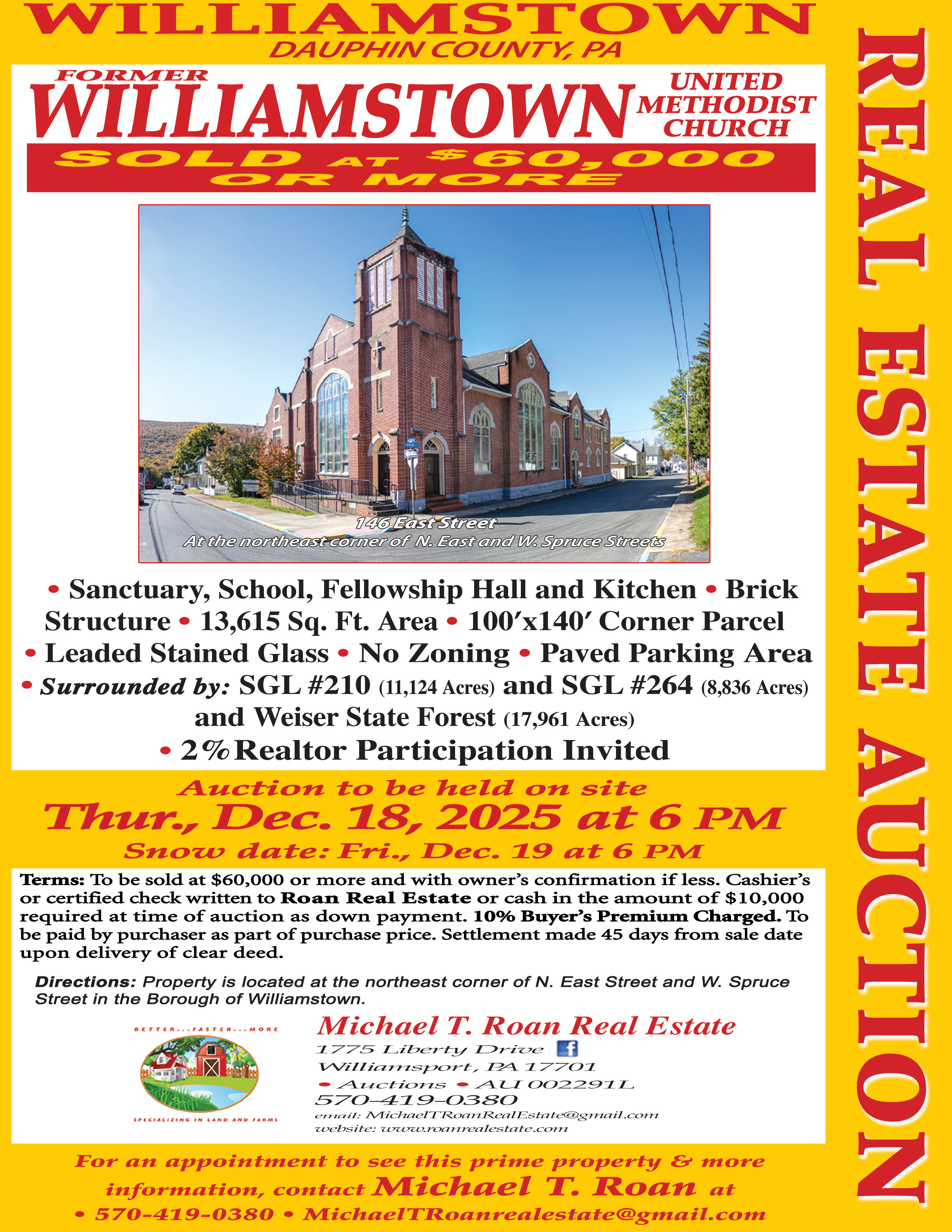 Terms: To be sold at $60,000 or more and with owner’s confirmation if less. Cashier’s or certified check written to Roan Real Estate or cash in the amount of $10,000 required at time of auction as down payment. 10% Buyer’s Premium Charged. To be paid by purchaser as part of purchase price. Settlement made 45 days from sale date upon delivery of clear deed.