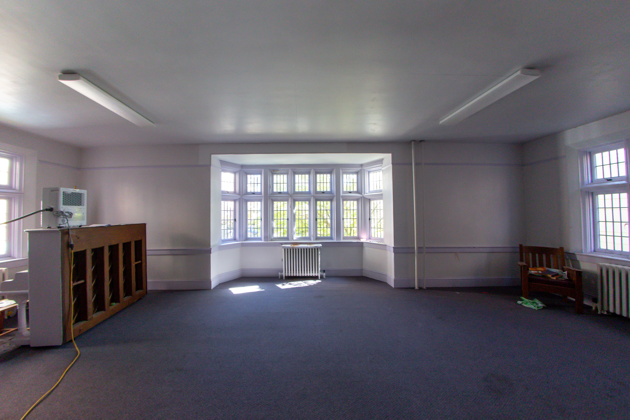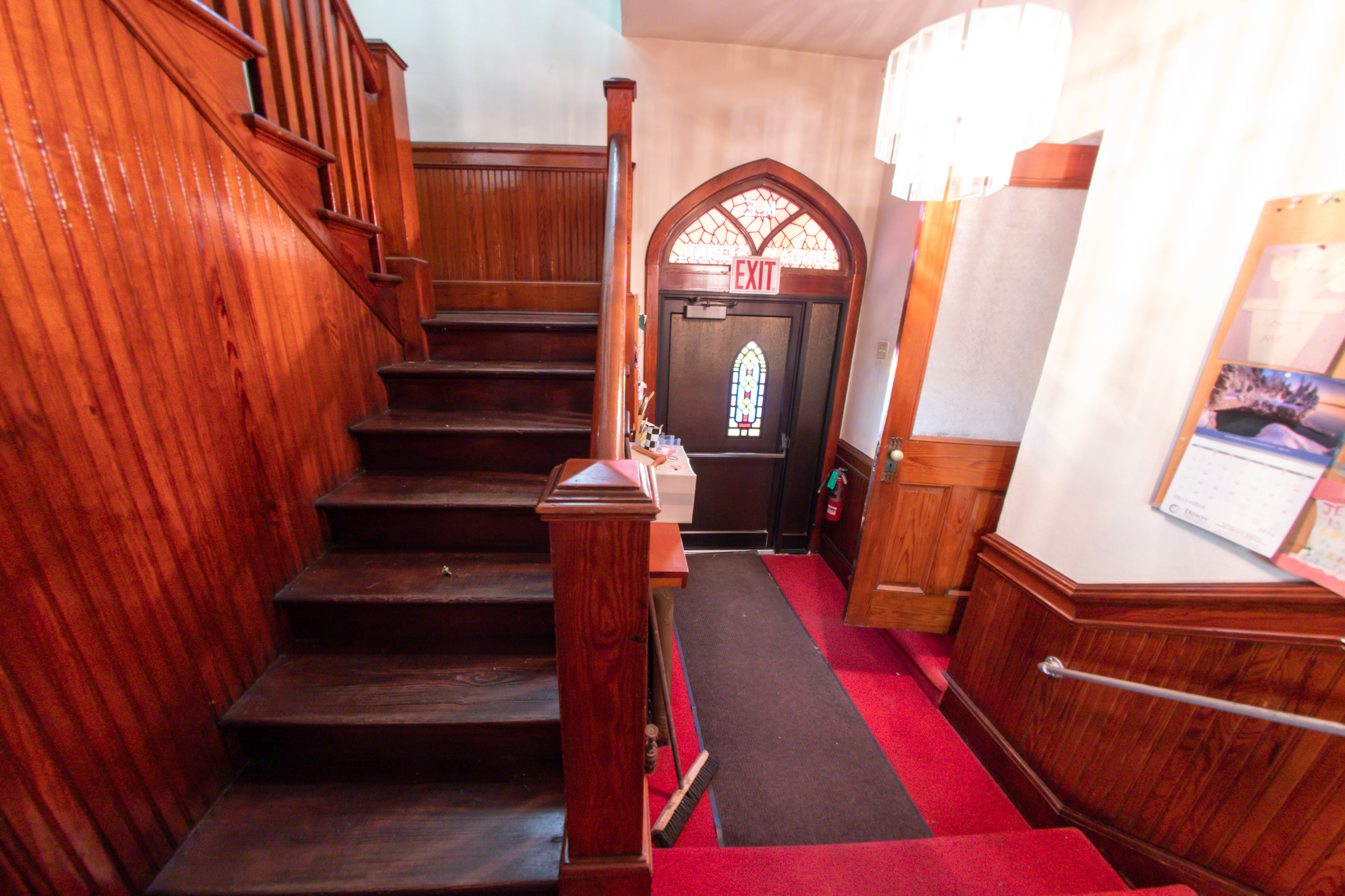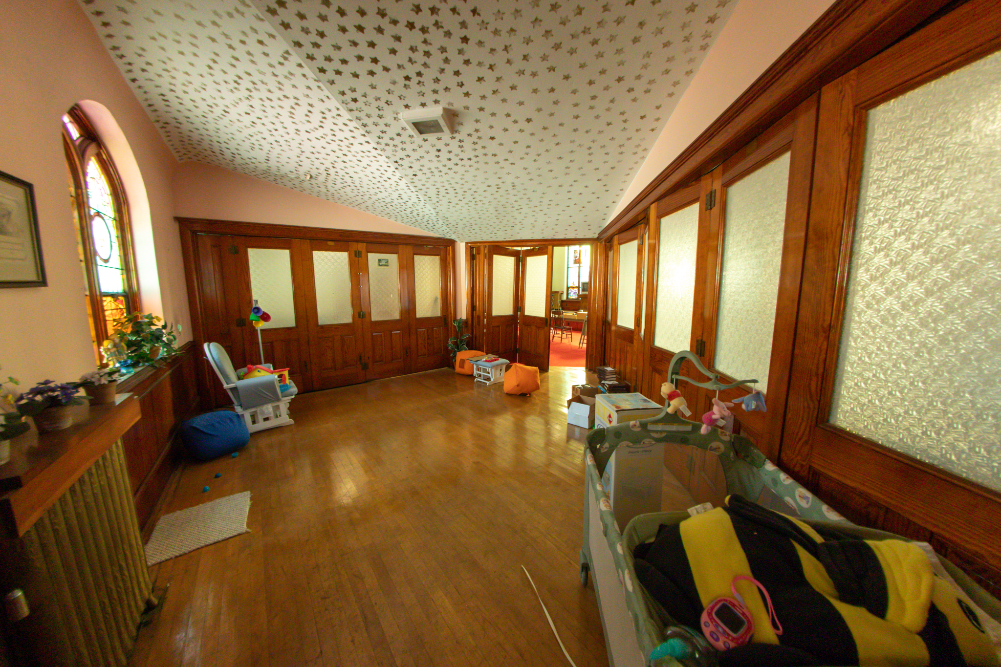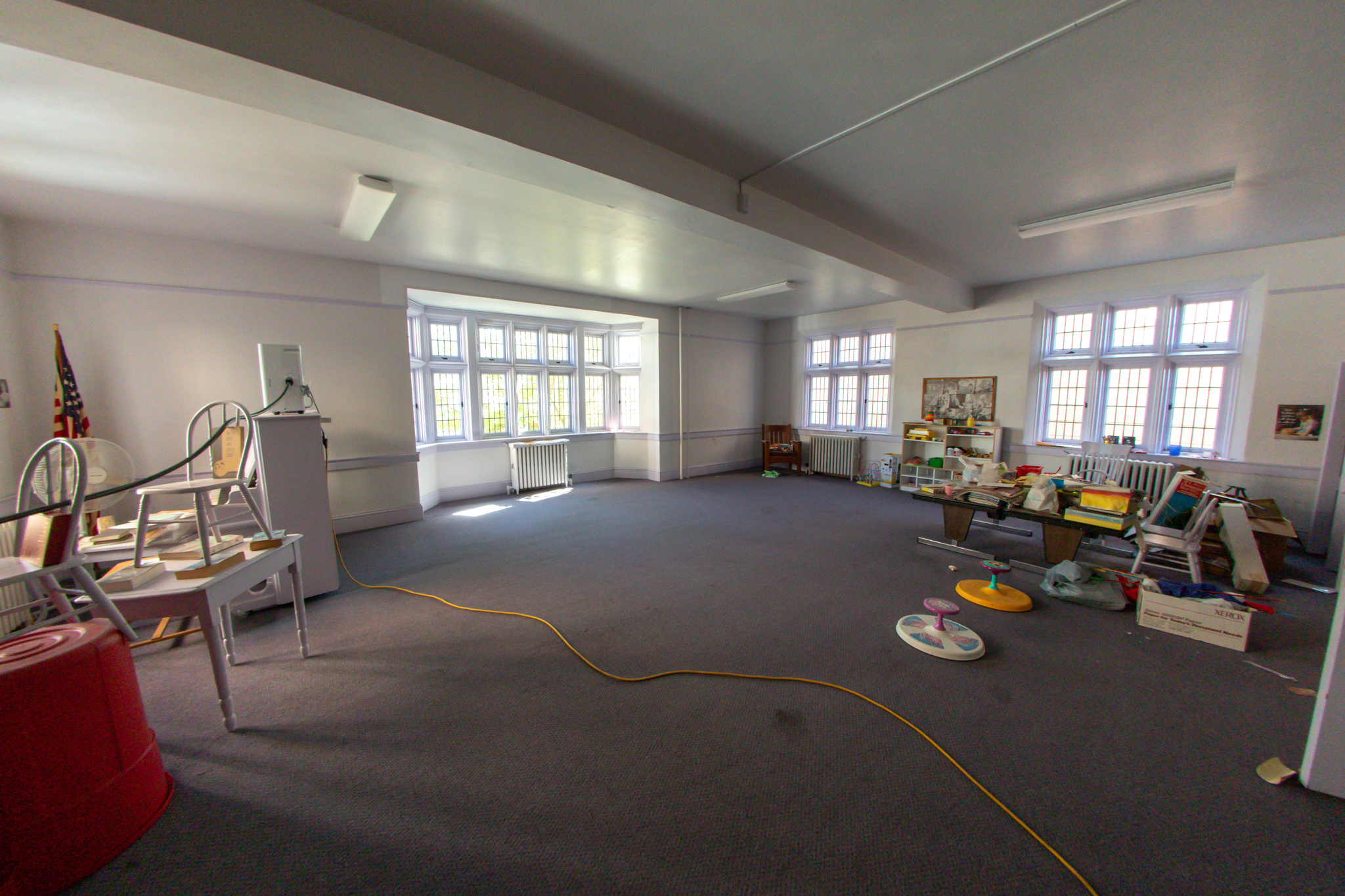 Sunday School: Access from East Street exterior, metal door to a foyer with carpet, Yellow Pine woodwork and Wainscot, bulletin board, access to second floor and fellowship hall, bathroom, coat closets, audio visual closet, 2 massive classrooms with leaded glass windows, brick fireplace, closets and fluorescent lighting.