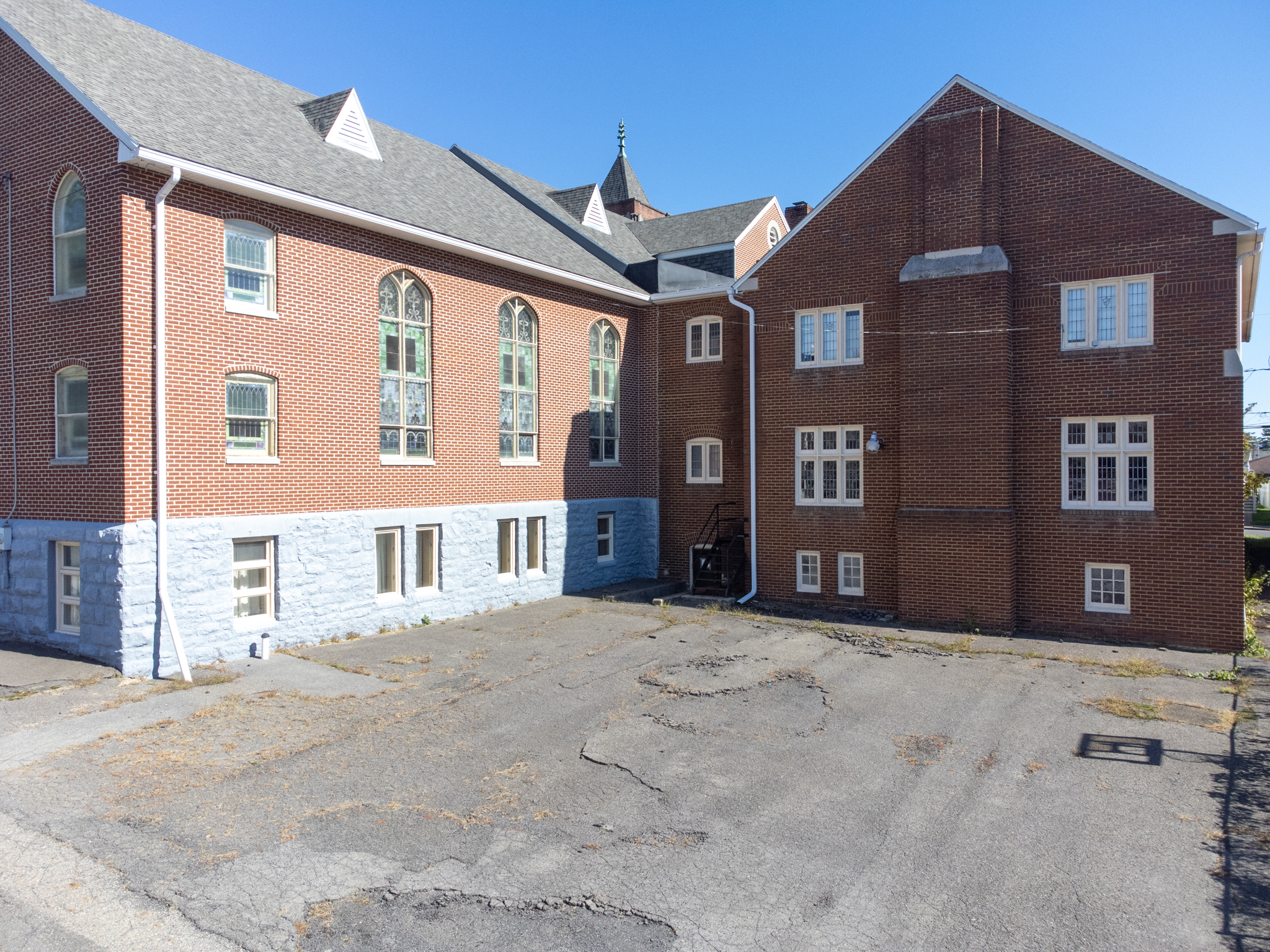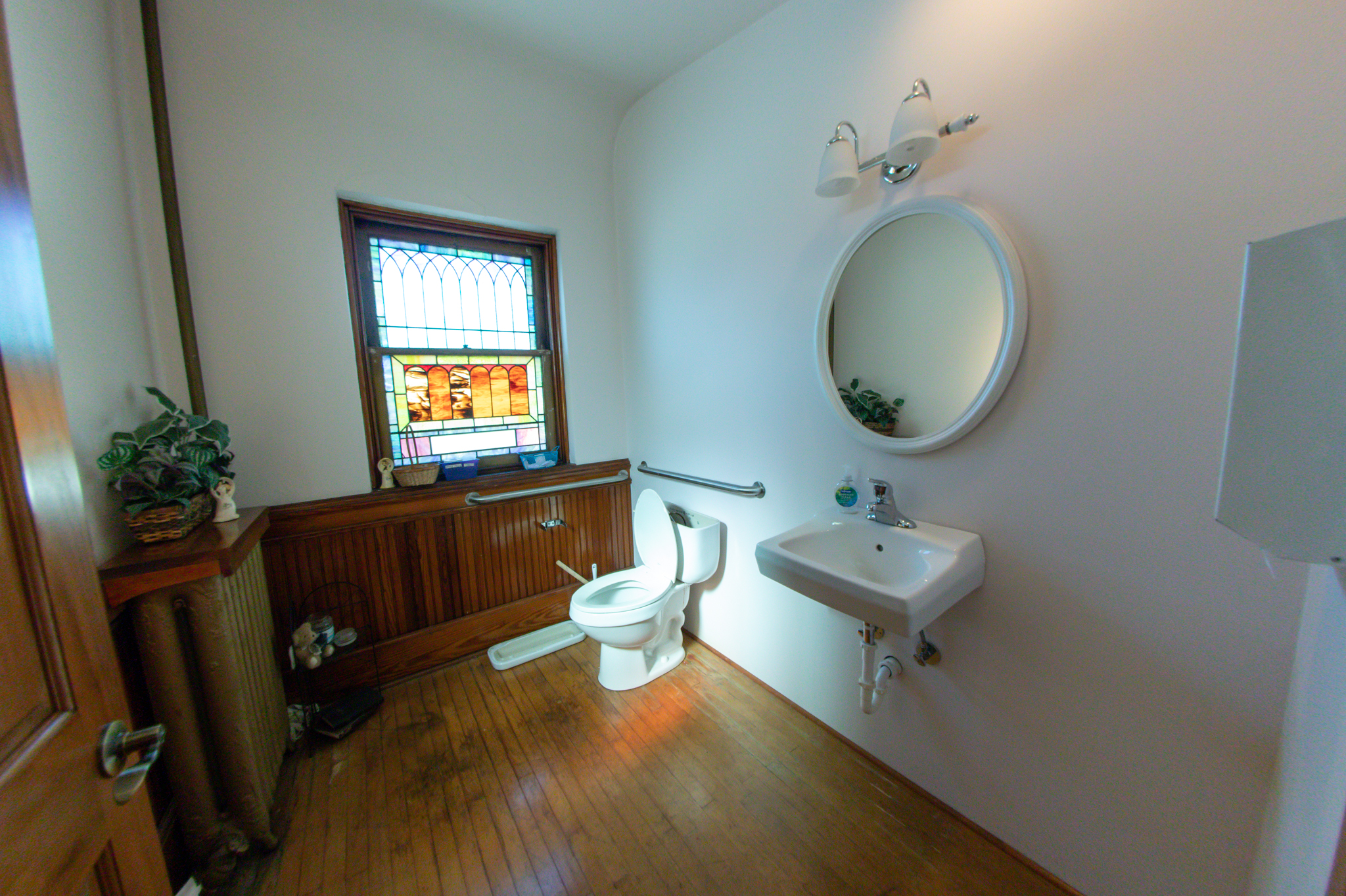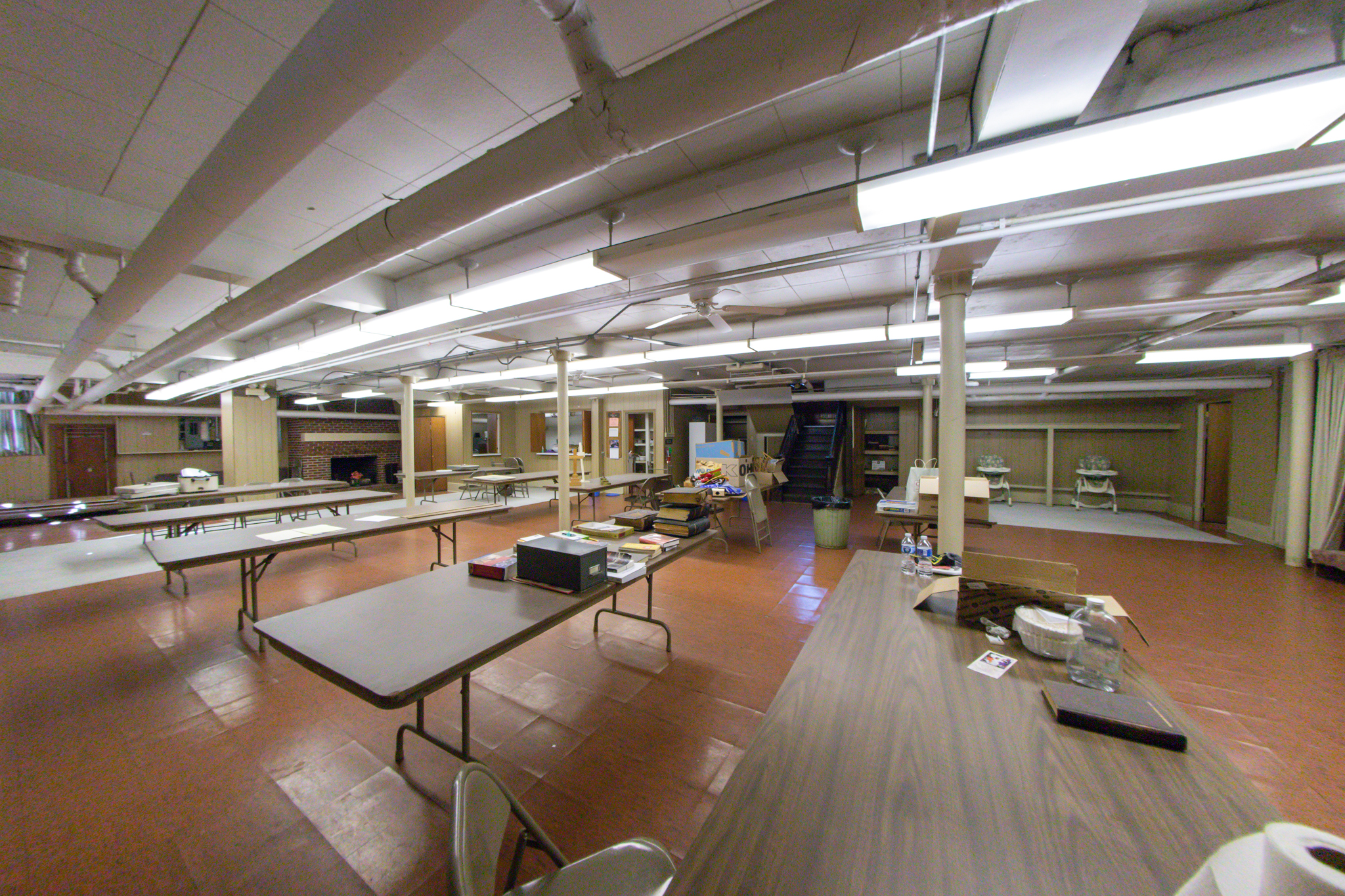 Sunday School: Access from East Street exterior, metal door to a foyer with carpet, Yellow Pine woodwork and Wainscot, bulletin board, access to second floor and fellowship hall, bathroom, coat closets, audio visual closet, 2 massive classrooms with leaded glass windows, brick fireplace, closets and fluorescent lighting.