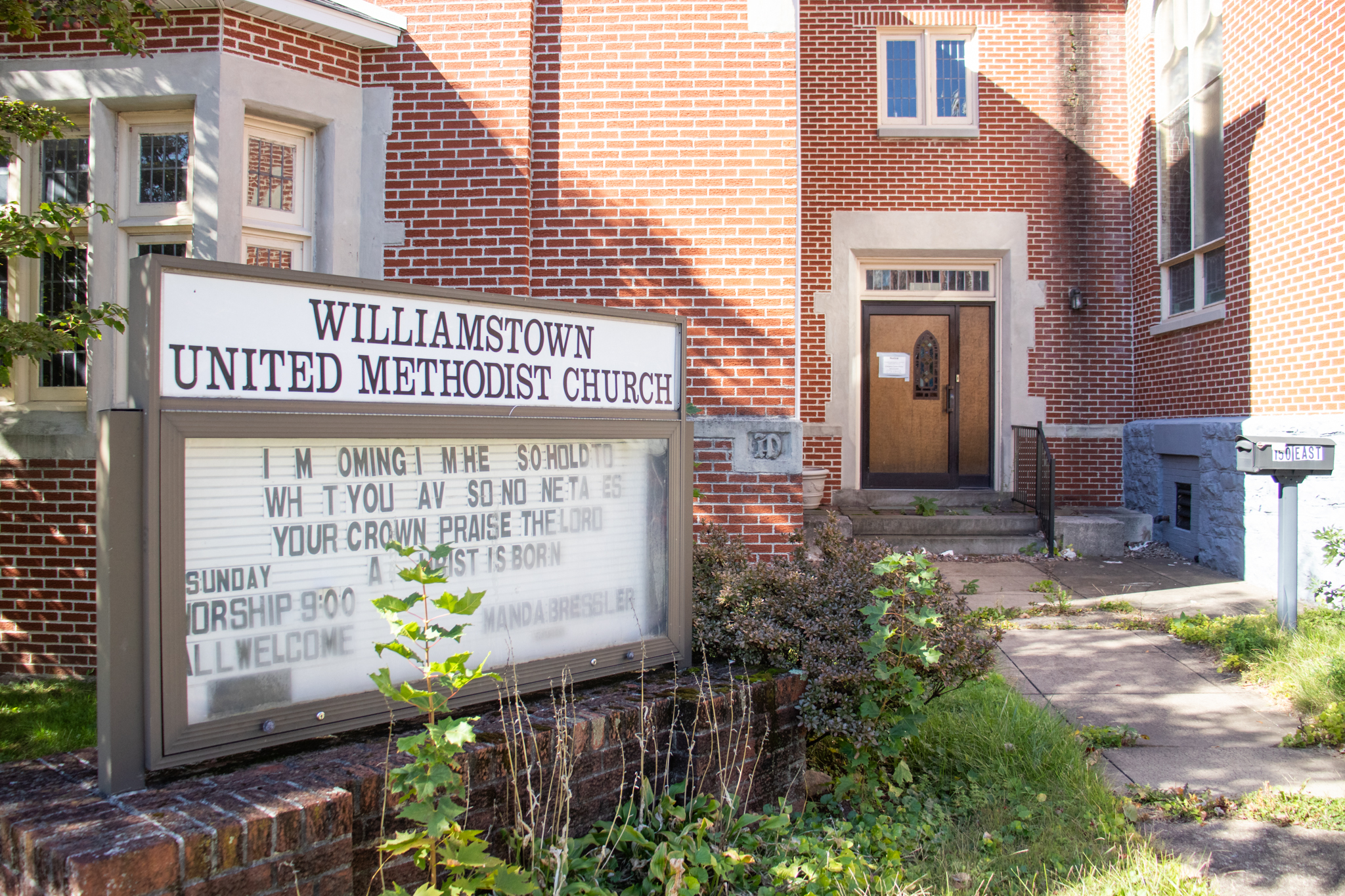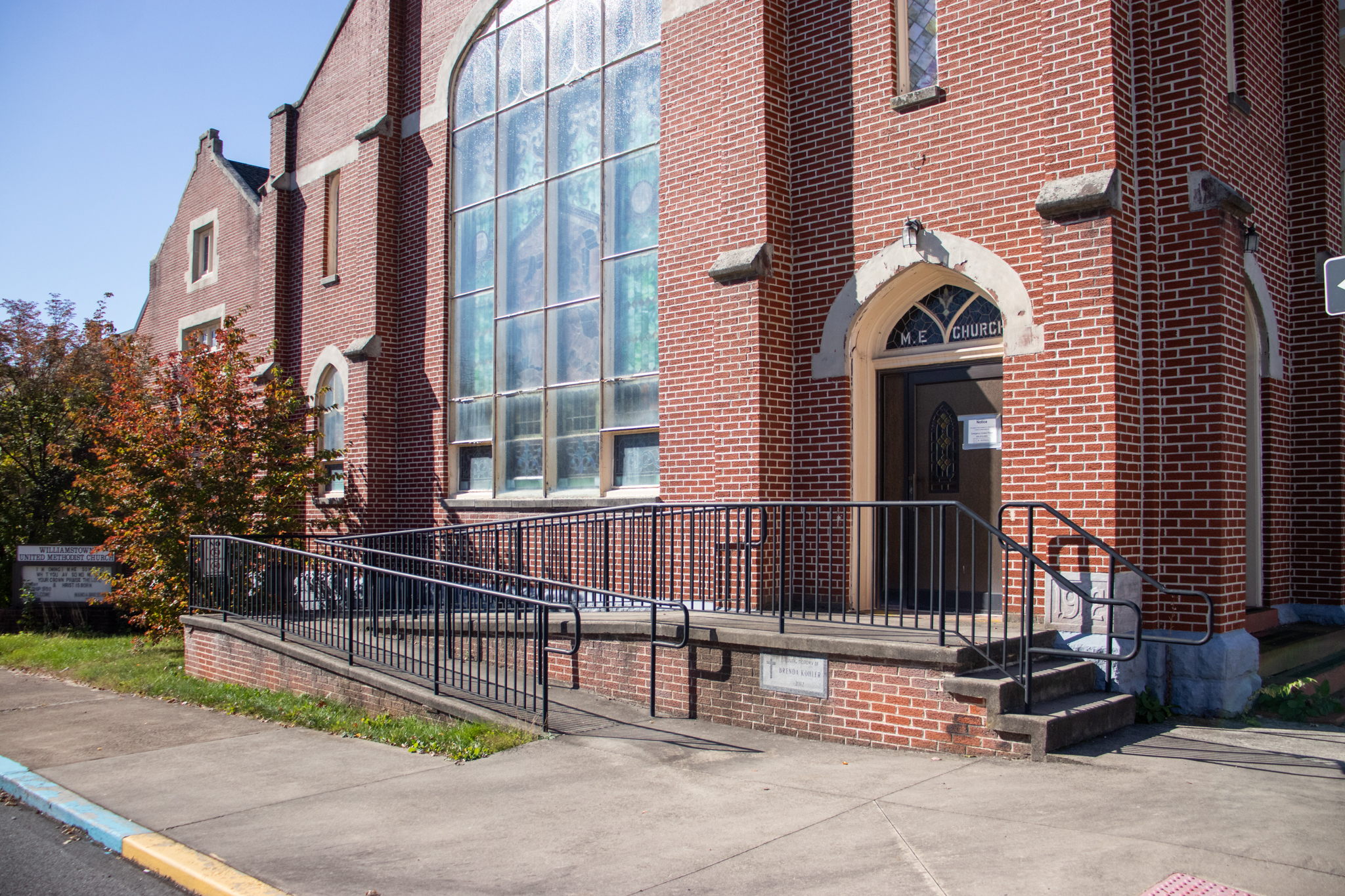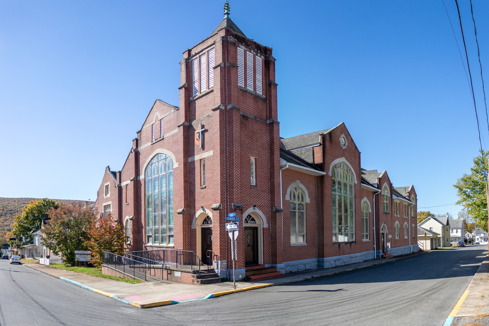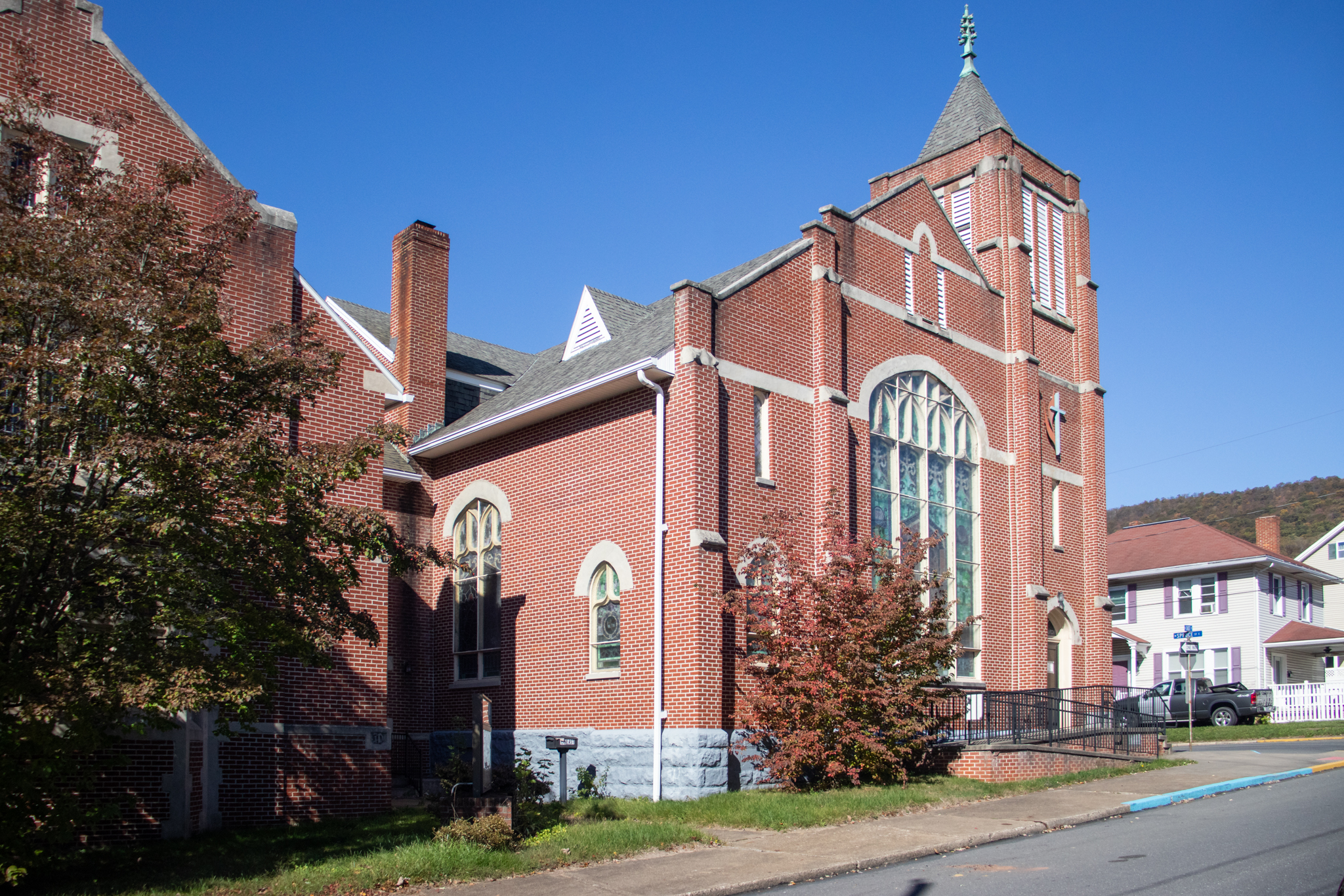 Sunday School: Access from East Street exterior, metal door to a foyer with carpet, Yellow Pine woodwork and Wainscot, bulletin board, access to second floor and fellowship hall, bathroom, coat closets, audio visual closet, 2 massive classrooms with leaded glass windows, brick fireplace, closets and fluorescent lighting.