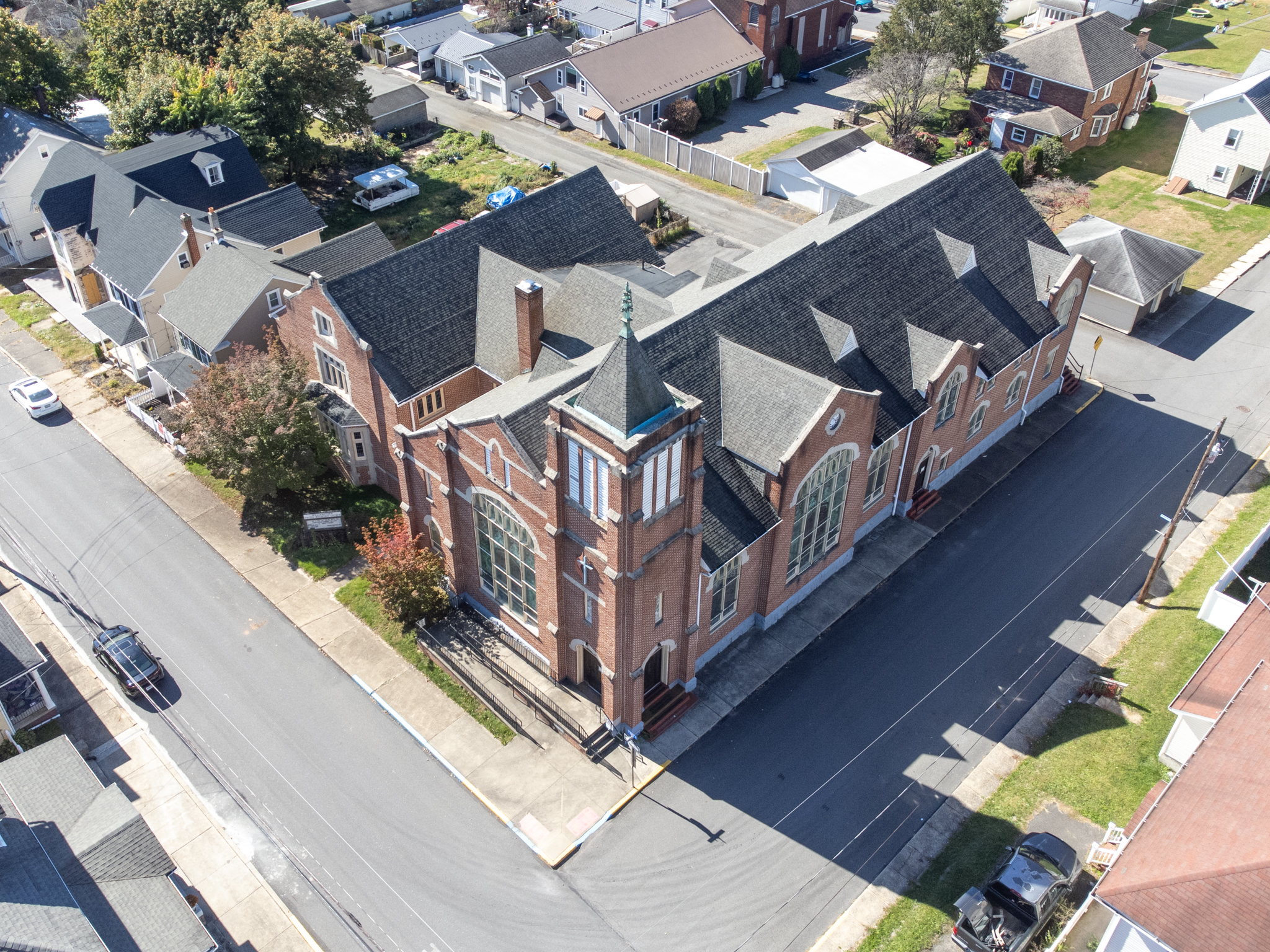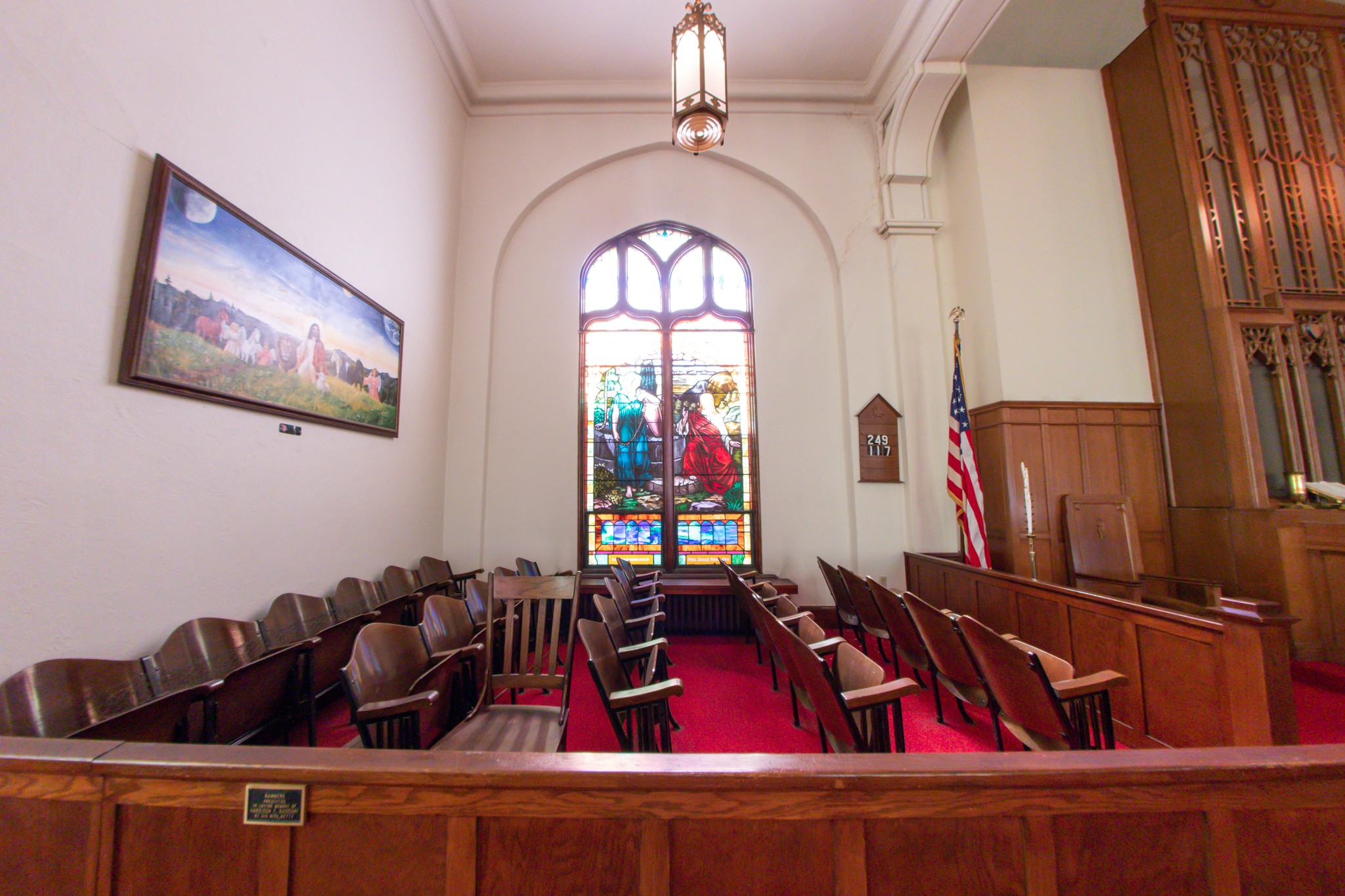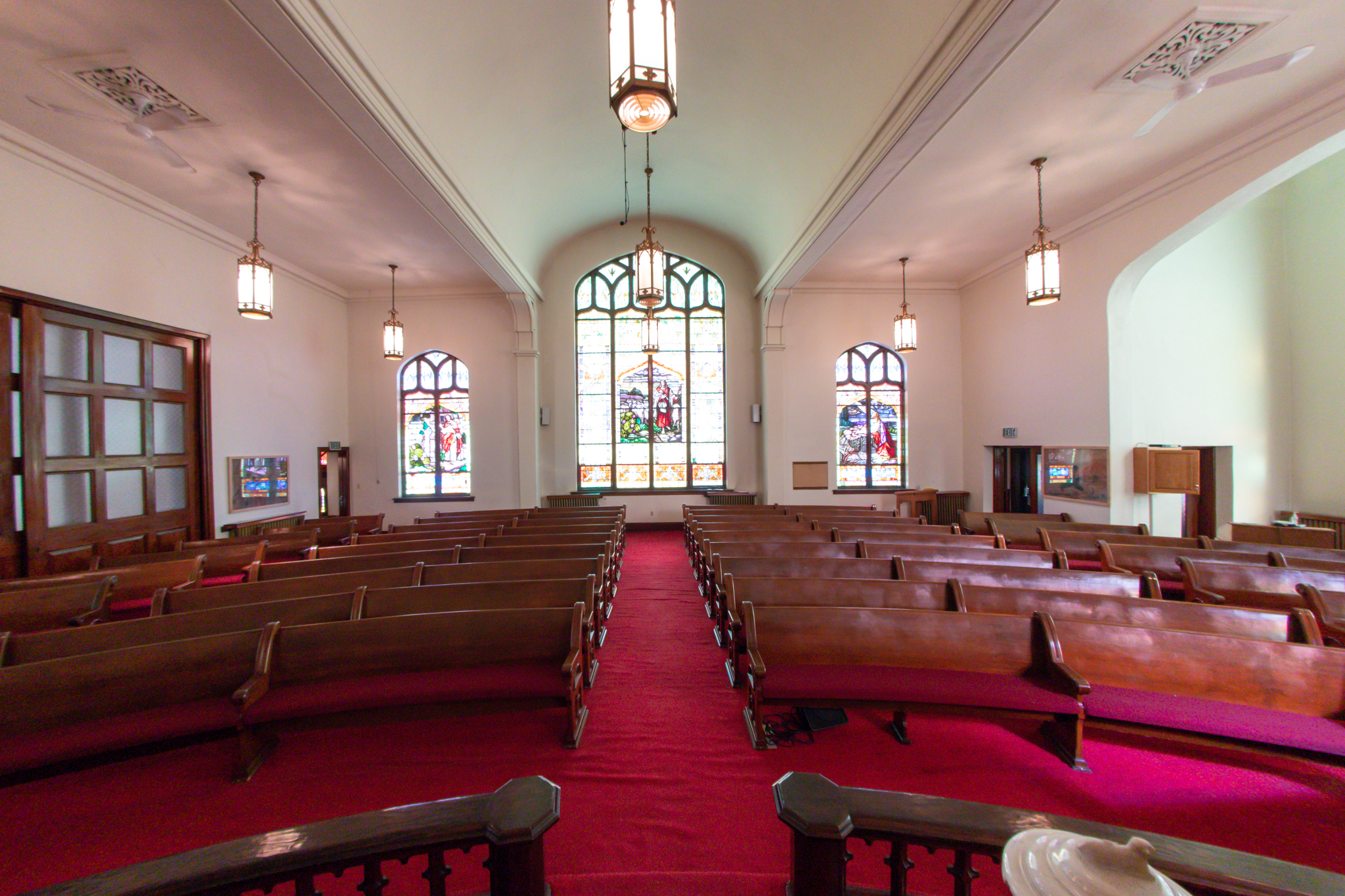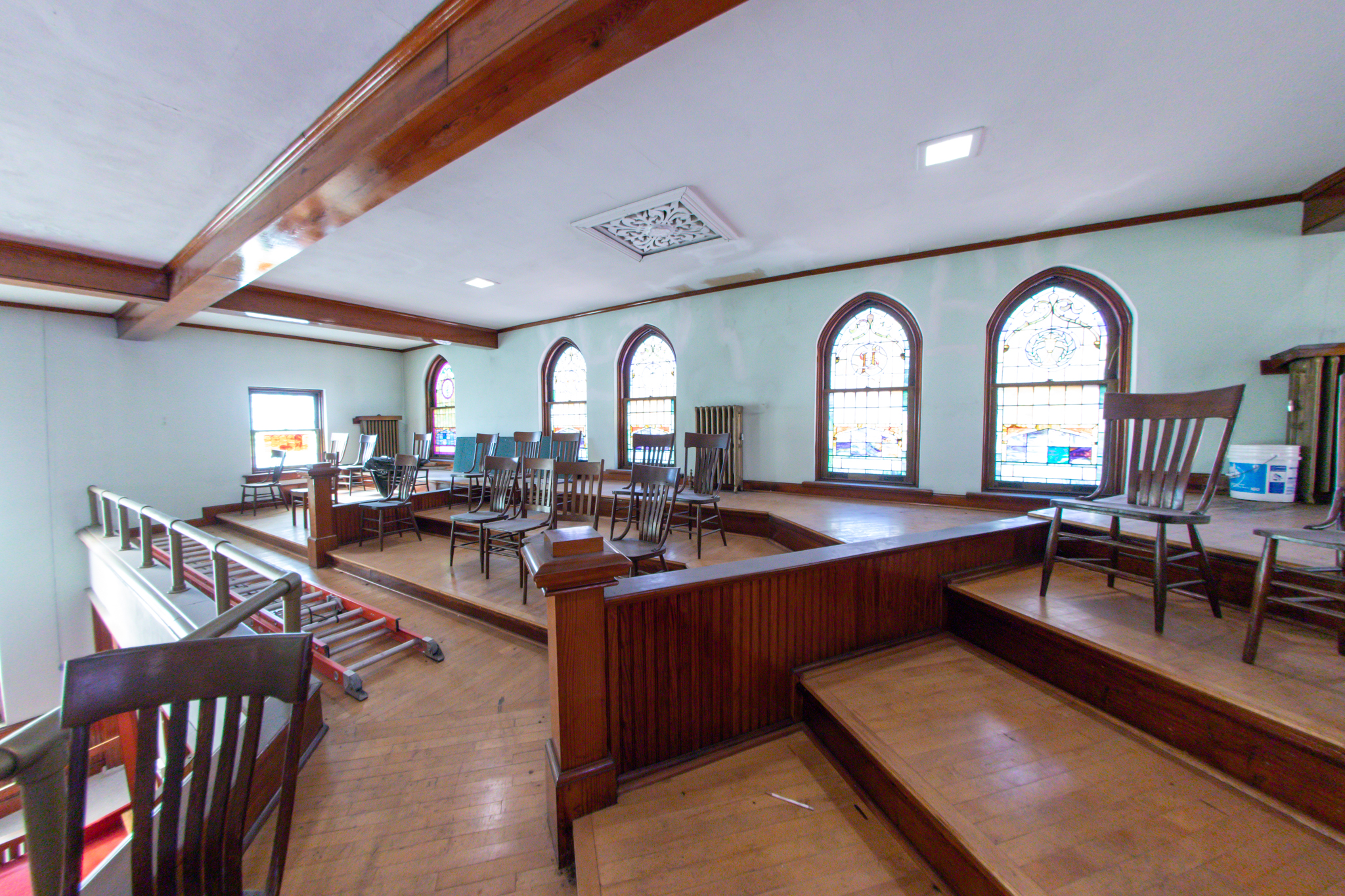 First Floor: Enter sanctuary with carpet, 5 massive stained glass windows, 11 hanging lights, ceiling fans, sound system, 31 walnut pews, pipe organ, massive sliding wood doors to Narthex with carpet, stage with maple hardwood floor, balcony, 3 classrooms with maple hardwood floor rest room, ceiling fans, 25+ leaded stained glass windows, yellow pine beamed ceiling, wood work and wainscot, access to lower level and exterior access.