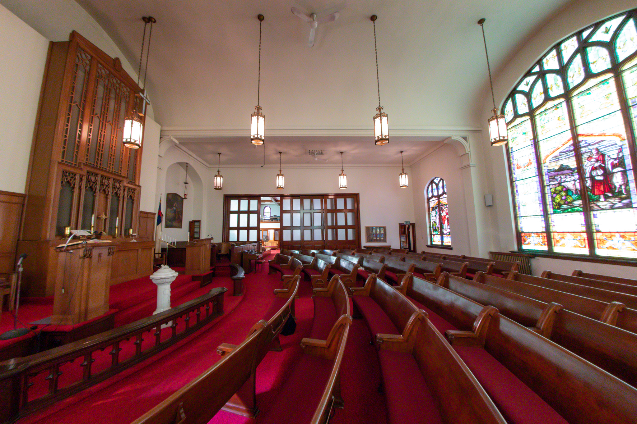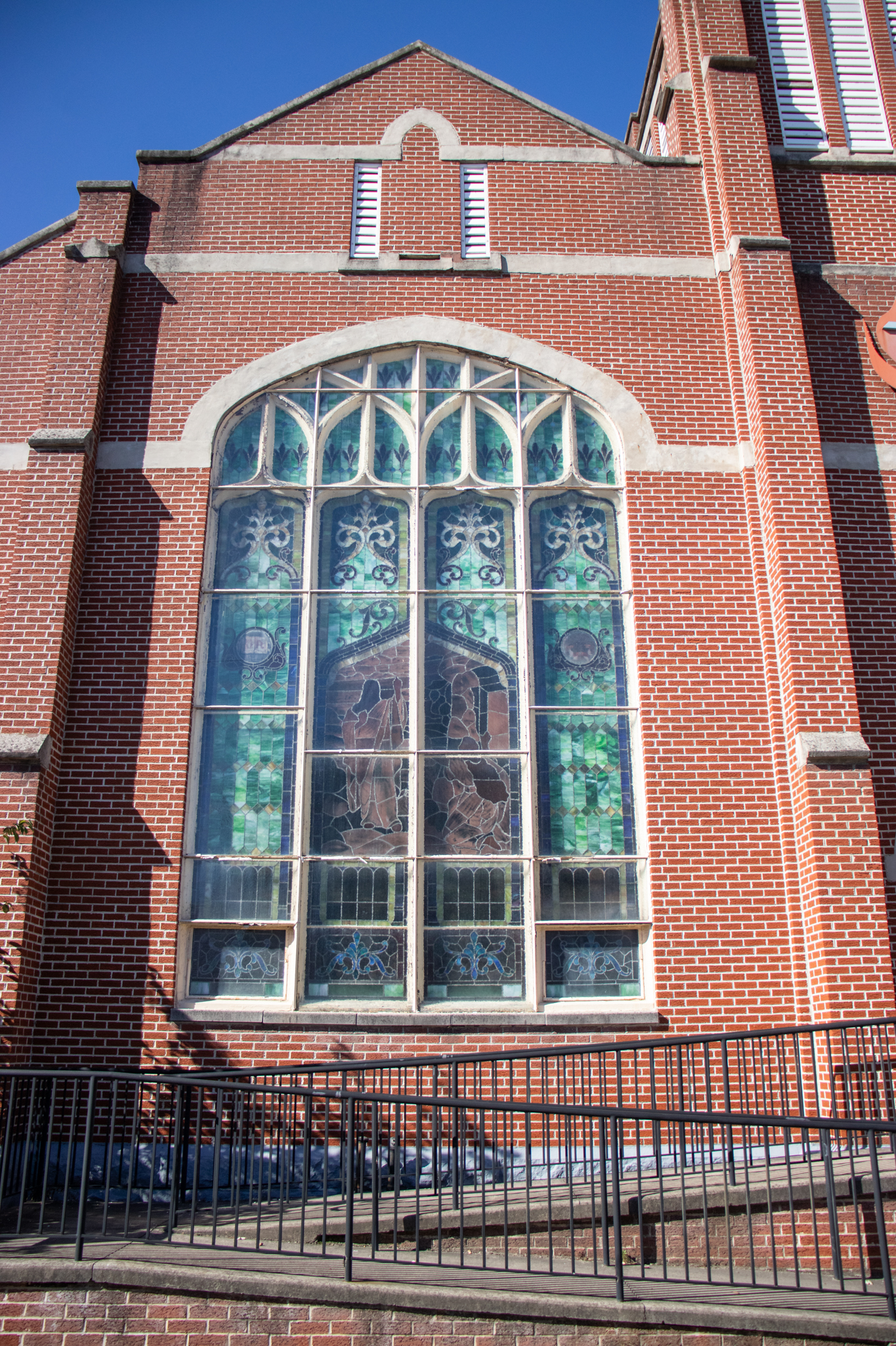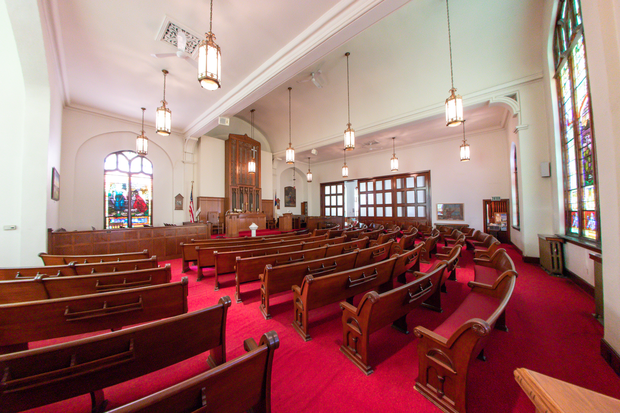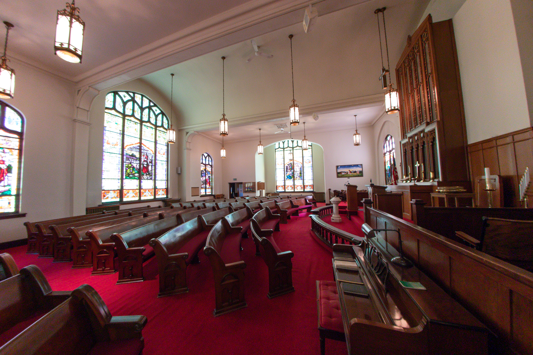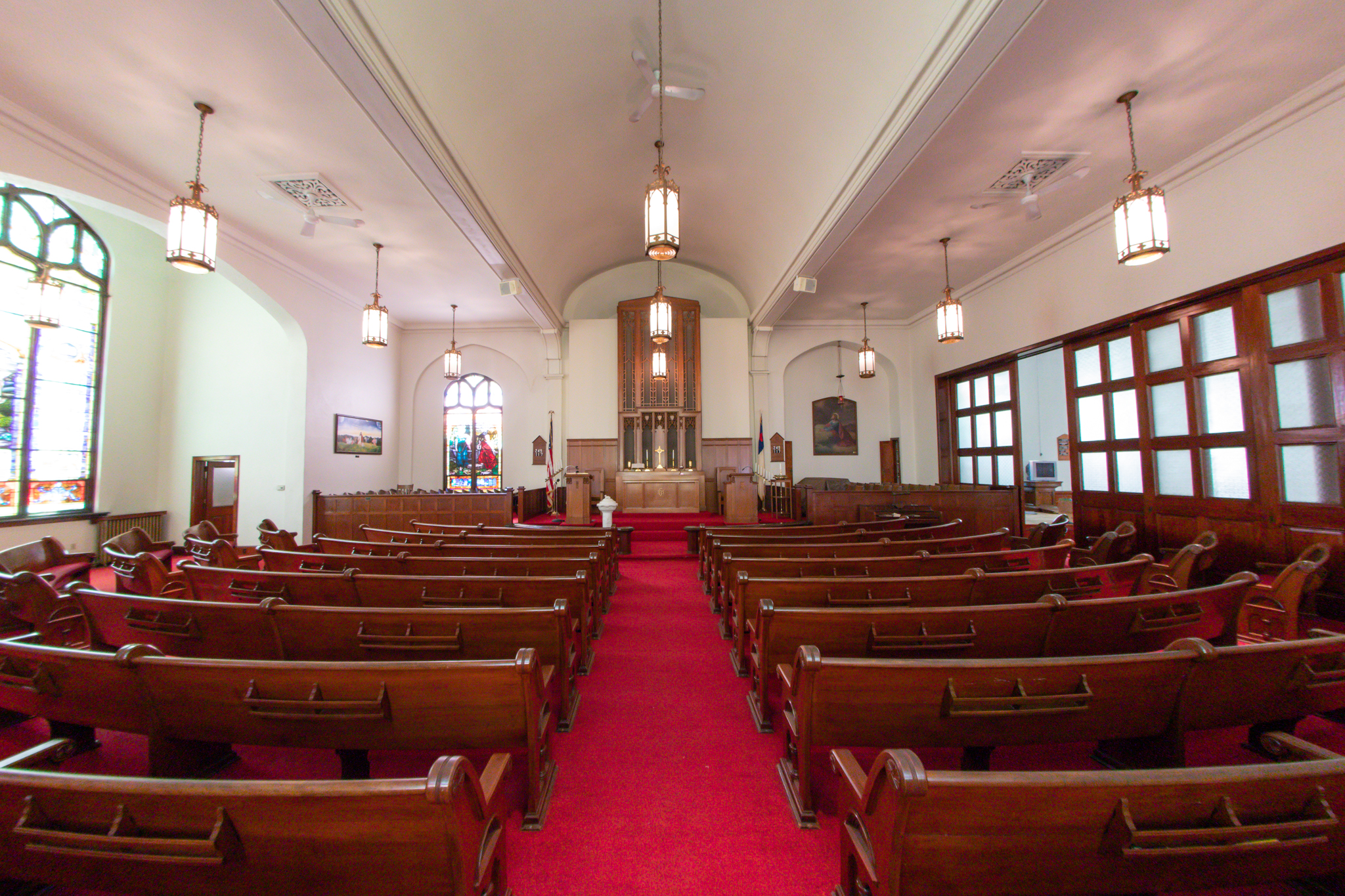 First Floor: Enter sanctuary with carpet, 5 massive stained glass windows, 11 hanging lights, ceiling fans, sound system, 31 walnut pews, pipe organ, massive sliding wood doors to Narthex with carpet, stage with maple hardwood floor, balcony, 3 classrooms with maple hardwood floor rest room, ceiling fans, 25+ leaded stained glass windows, yellow pine beamed ceiling, wood work and wainscot, access to lower level and exterior access.