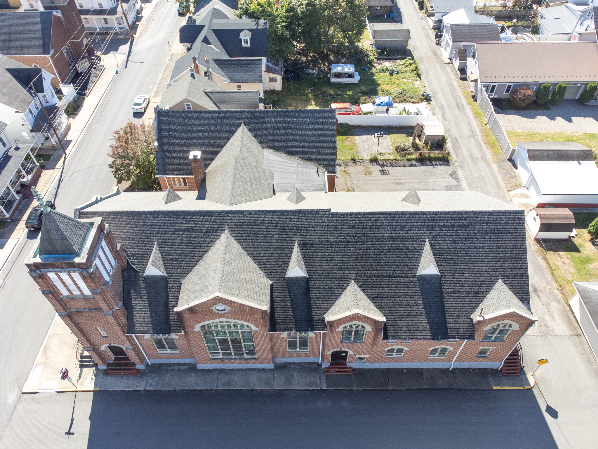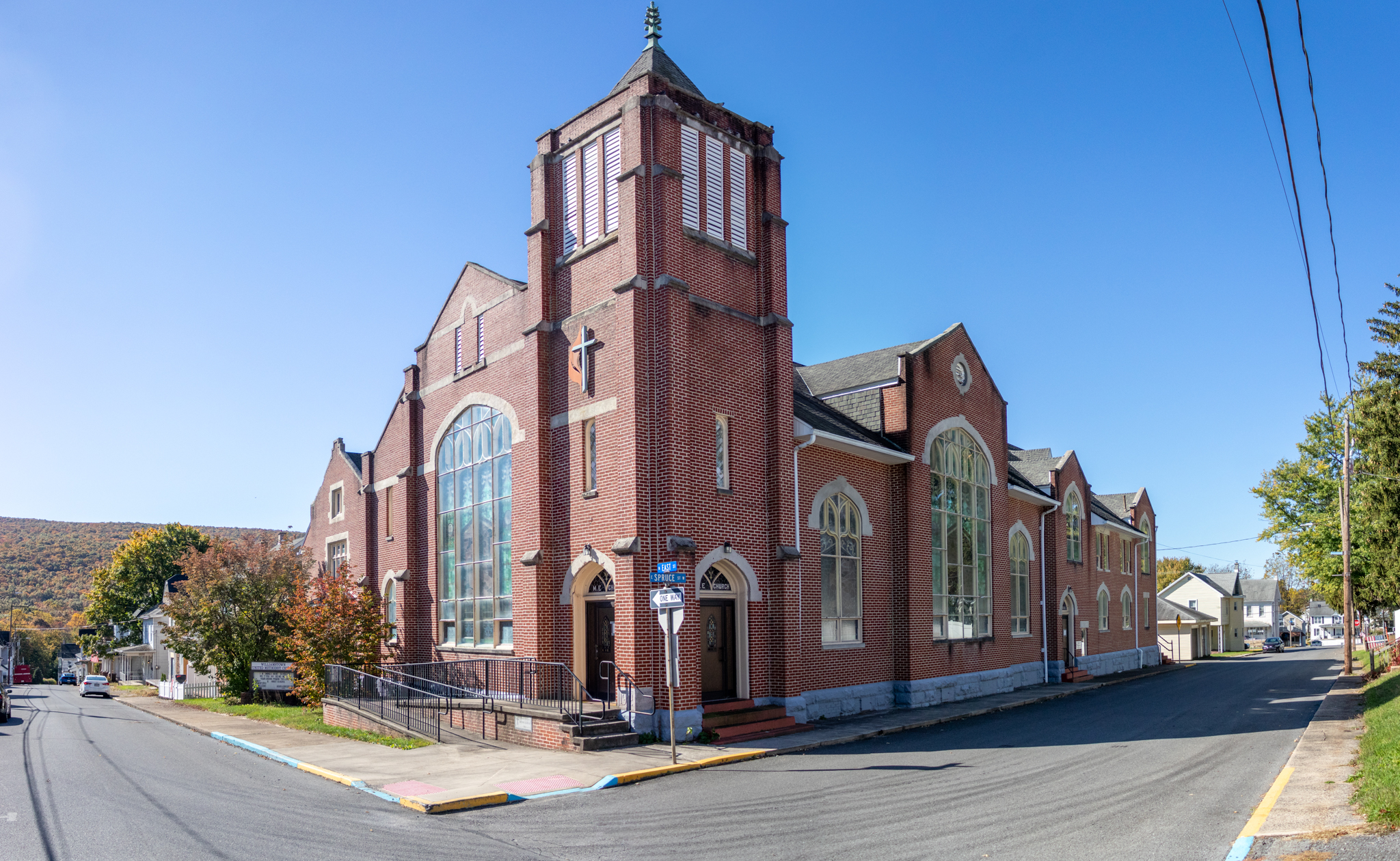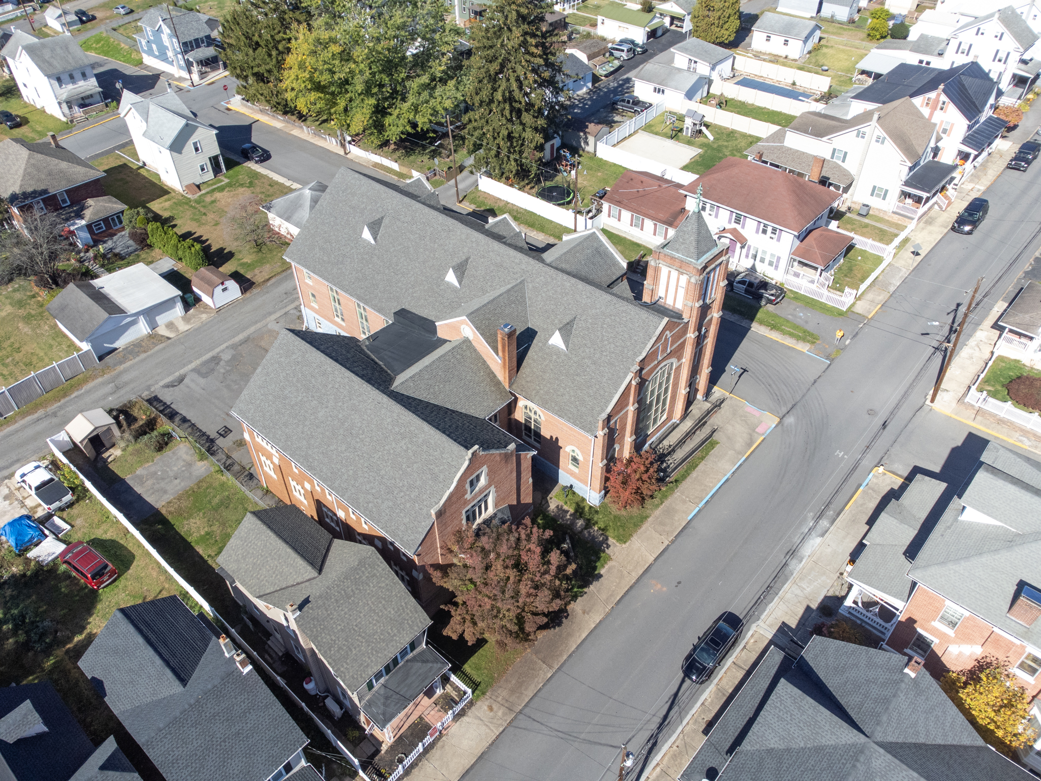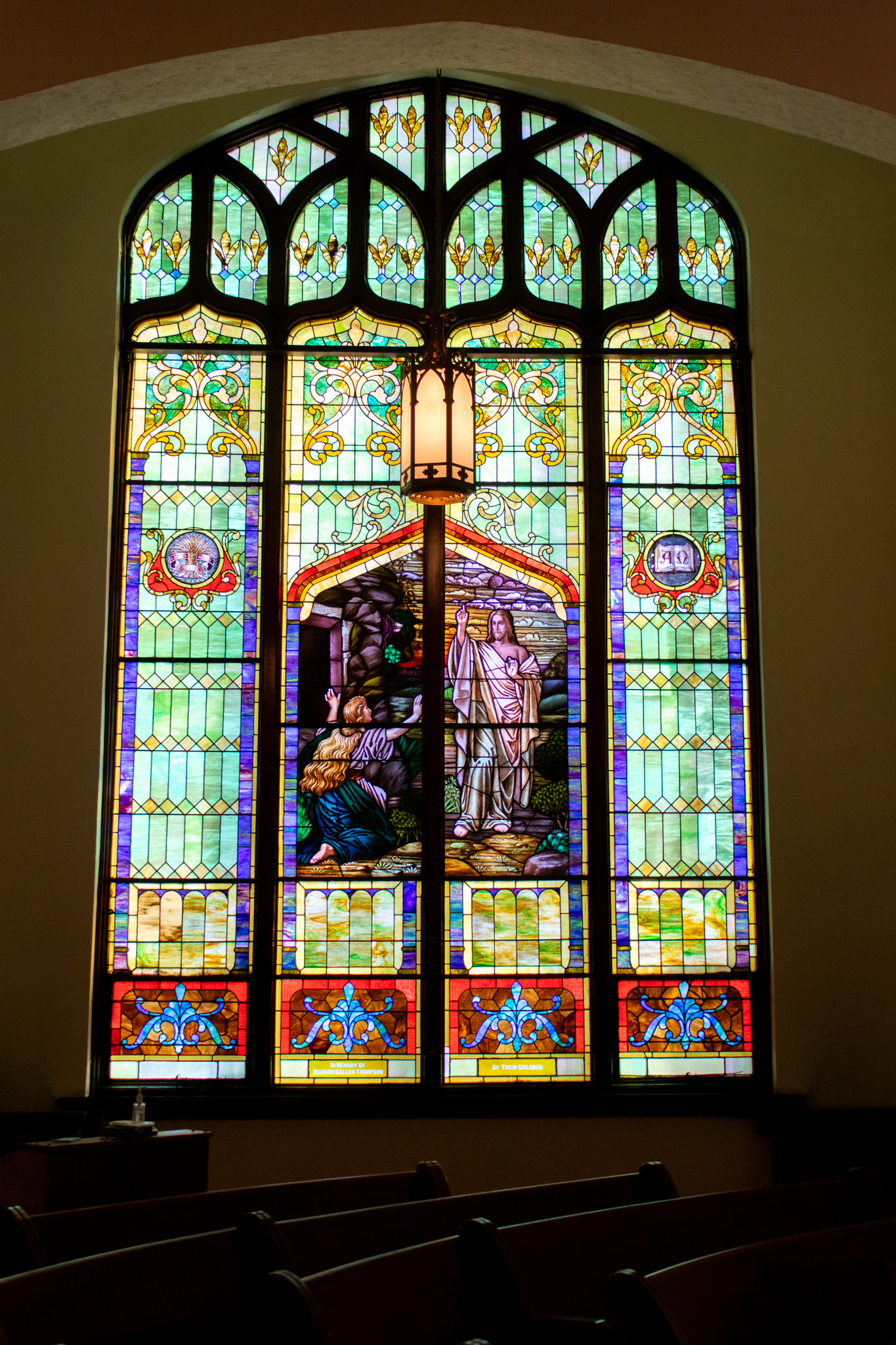 First Floor: Enter sanctuary with carpet, 5 massive stained glass windows, 11 hanging lights, ceiling fans, sound system, 31 walnut pews, pipe organ, massive sliding wood doors to Narthex with carpet, stage with maple hardwood floor, balcony, 3 classrooms with maple hardwood floor rest room, ceiling fans, 25+ leaded stained glass windows, yellow pine beamed ceiling, wood work and wainscot, access to lower level and exterior access.