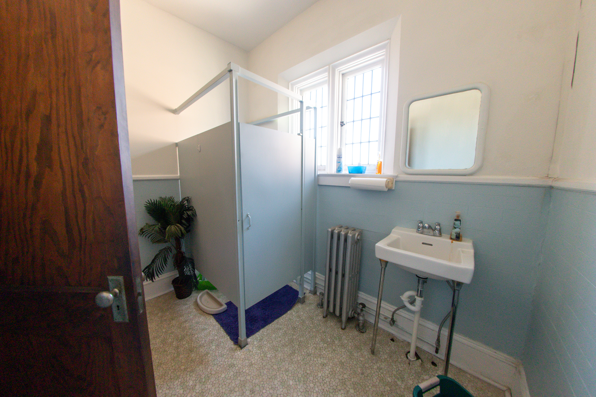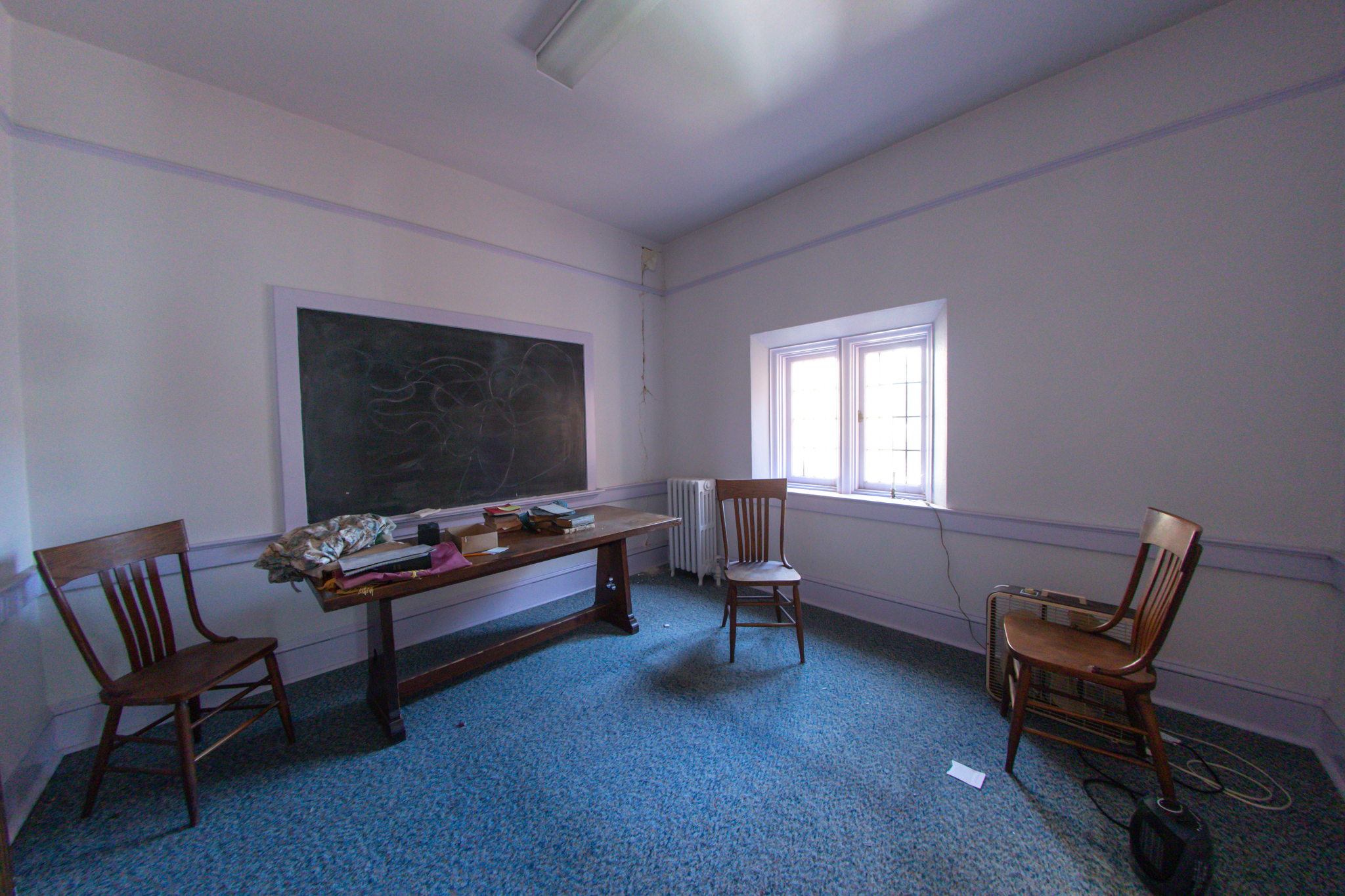 Second floor: Yellow Pine staircase up to a foyer with broom closet, access to a bathroom, large classroom with stage, leaded glass windows, carpet, closet, fluorescent lighting, classroom, office with Yellow Pine floor, Brick fireplace with a tile hearth and a yellow pine mantle, windows, lighted ceiling fan and coat closet
