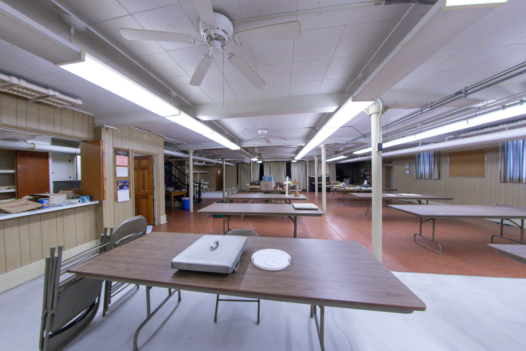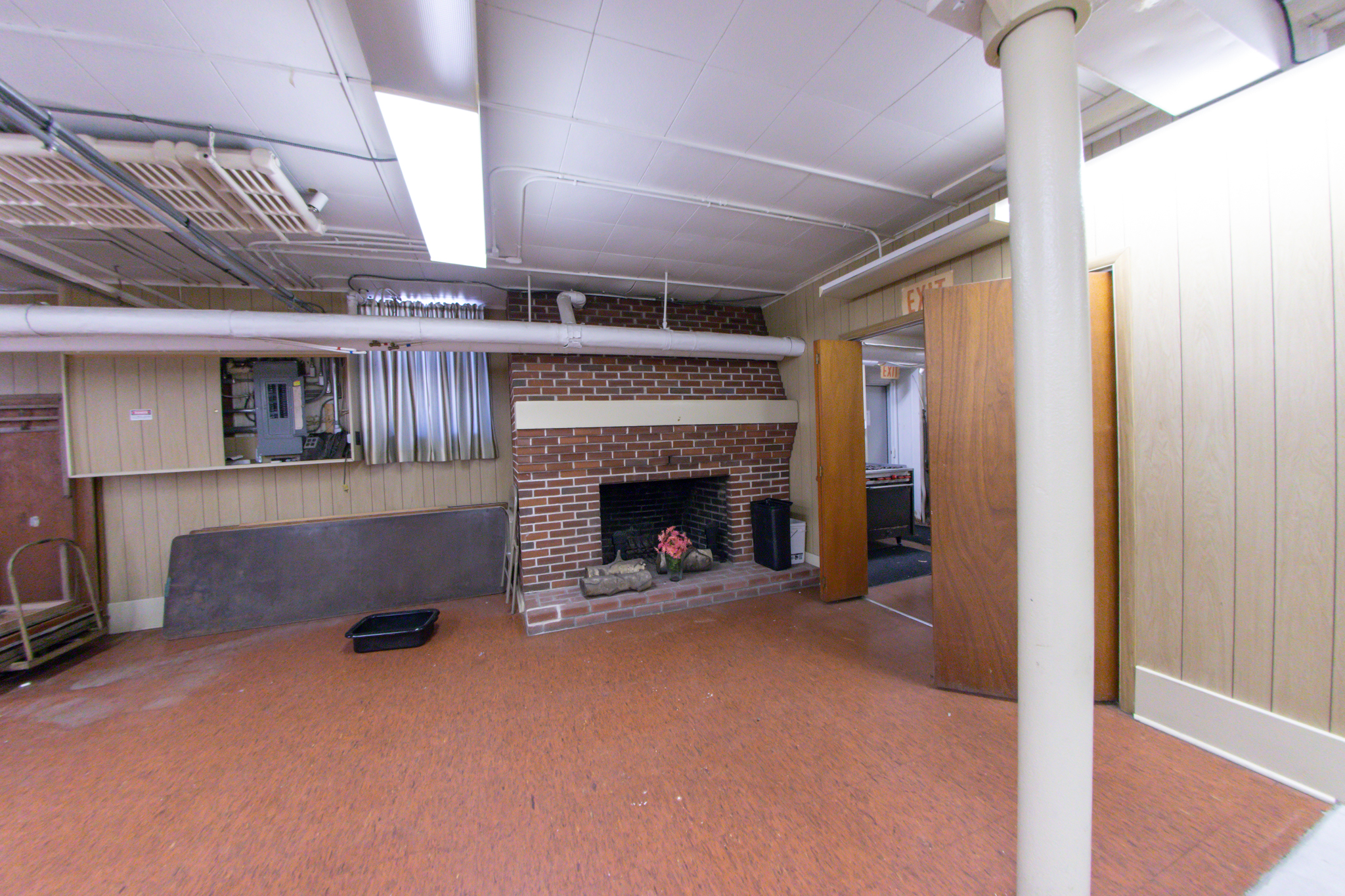 Lower Level: Access from Narthax and lower level exterior to the fellowship hall and kitchen with tile flooring, ceiling fans, fluorescent lighting, windows, brick fireplace with a brick hearth and a concrete mantle, coat rack, closet space with shelves, stage, choir room, boiler room, rest rooms, exterior access, kitchen has cupboards, cabinets, shelves, two bowl stainless steel sink with pot scrubber, pizza ovens, self-contained refrigerators, propane gas stove, exhaust fan and has serving doors and dirty dish doors,